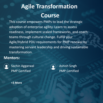 This course is specifically tailored for Project Management Professionals (PMPs) seeking to renew their certification by fulfilling the Agile/Hybrid project management education requirement. It focuses on the strategic and operational aspects of Agile Transformation, preparing project leaders to champion and guide their organizations through complex changes.