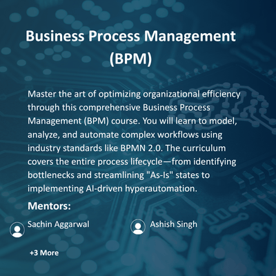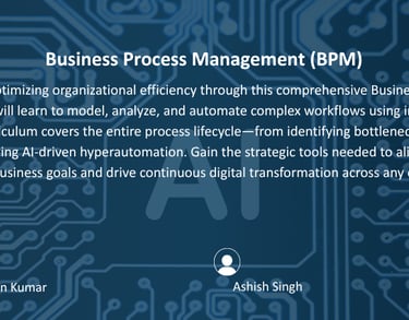Master the art of optimizing organizational efficiency through this comprehensive Business Process Management (BPM) course. You will learn to model, analyze, and automate complex workflows using industry standards like BPMN 2.0. The curriculum covers the entire process lifecycle—from identifying bottlenecks and streamlining "As-Is" states to implementing AI-driven hyperautomation. Gain the strategic tools needed to align operational performance with business goals and drive continuous digital transformation across any enterprise.