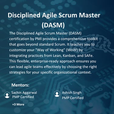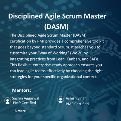 The Disciplined Agile Scrum Master (DASM) certification from PMI is a comprehensive, toolkit-based approach that transcends the limitations of standard Scrum. It empowers practitioners to move beyond a "one-size-fits-all" mindset by providing a flexible framework to customize their "Way of Working" (WoW).