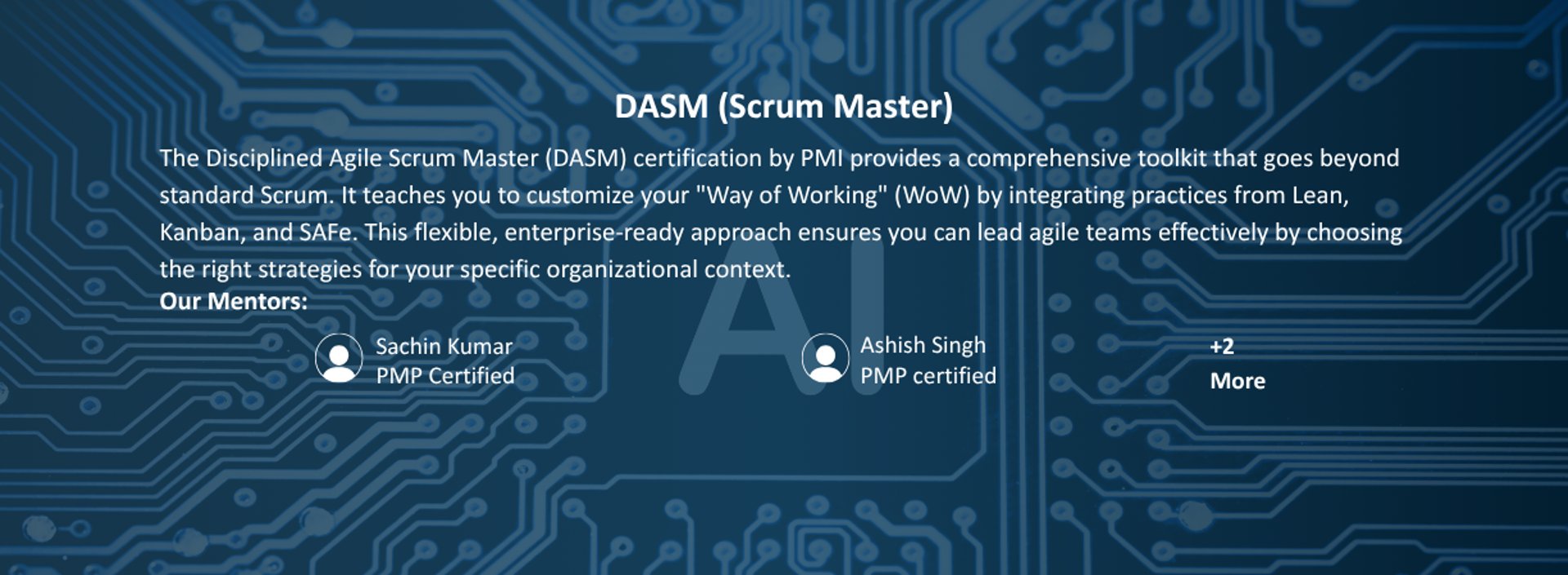 By integrating proven strategies from Lean, Kanban, SAFe, and Agile, DASM allows you to choose the best practices for your specific team and organizational context. This certification ensures you can effectively lead agile teams in any enterprise environment, focusing on delivering high-value results while tailoring processes to meet unique project demands and complex business goals.