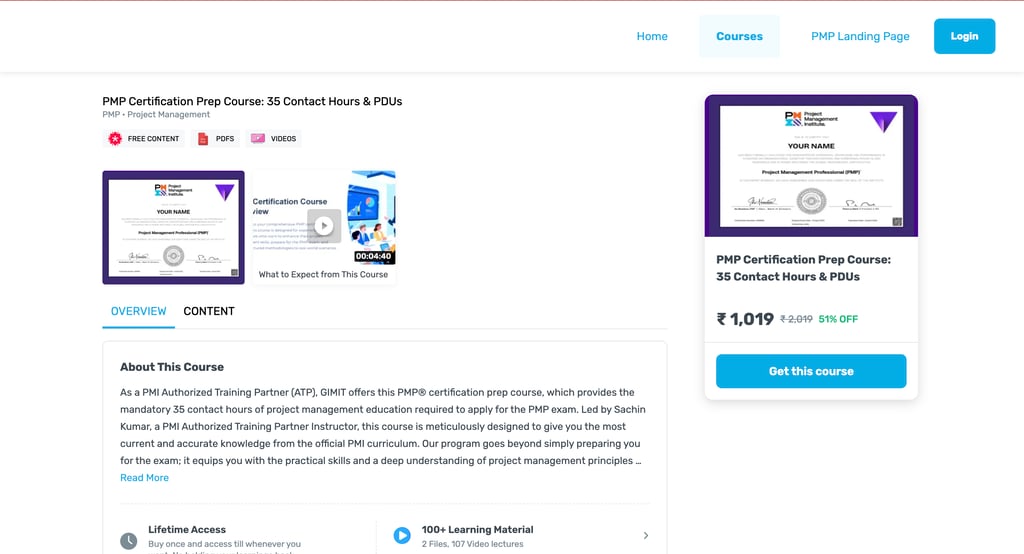 The course is available at just ₹1019, which includes lifetime access, mentorship, practice resources, 35 PDUs, and an official certificate of completion.