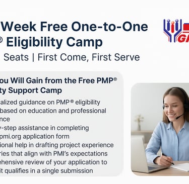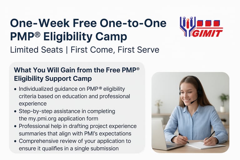 Completing your PMP® eligibility application accurately is the first crucial step toward certification. Many capable professionals face unnecessary delays or rejections due to incomplete or unclear submissions. GIMIT’s Free One-Week PMP® Eligibility Camp eliminates that risk by helping you submit a compliant, complete, and PMI-approved application on your first attempt.
