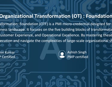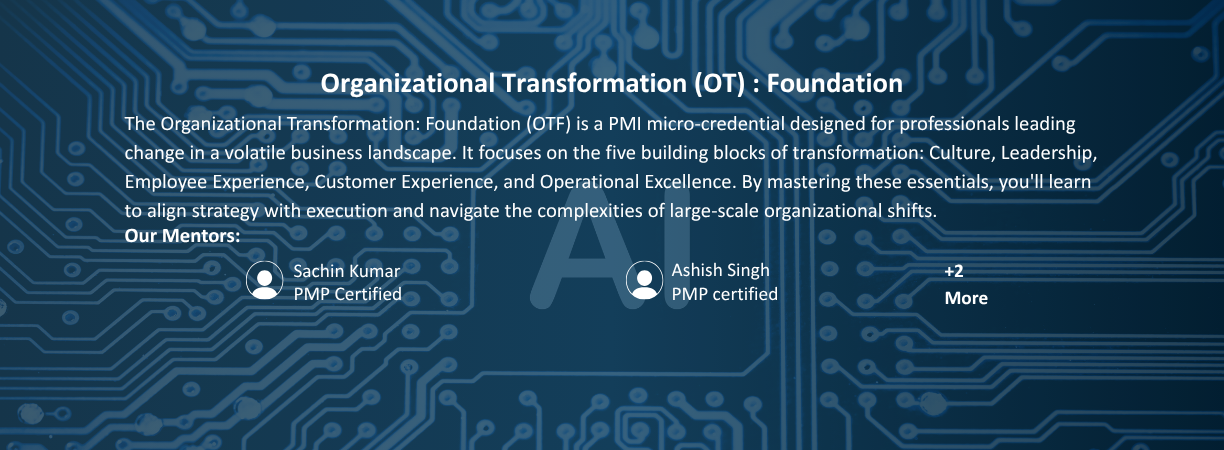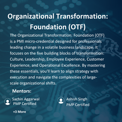 The Organizational Transformation: Foundation (OTF) is a strategic PMI micro-credential designed for professionals spearheading change in today’s volatile business landscape. It provides a robust framework centered on five critical building blocks: Culture, Leadership, Employee Experience, Customer Experience, and Operational Excellence. By mastering these essentials, you will gain the expertise to bridge the gap between high-level strategy and tactical execution. This certification empowers you to navigate the human and operational complexities of large-scale shifts, ensuring that transformations are not only launched successfully but are also sustainable, driving long-term agility and competitive advantage within your organization.