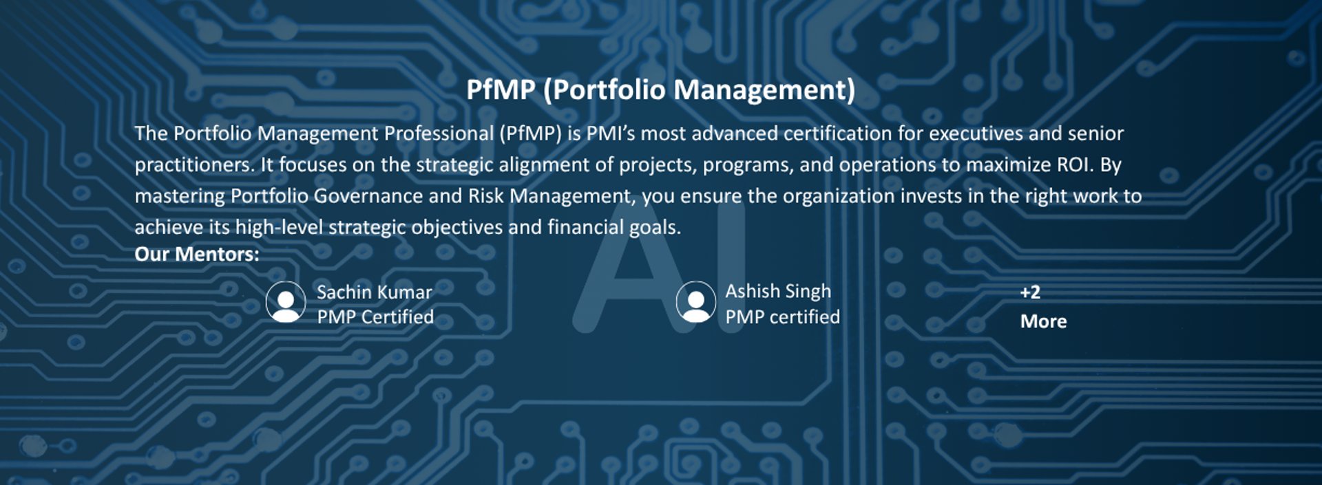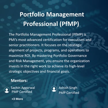 The Portfolio Management Professional (PfMP) is PMI’s premier credential for executives and senior leaders. It validates your expertise in the strategic oversight of projects, programs, and operations to ensure they collectively maximize ROI. Unlike project management, which focuses on "doing the work right," portfolio management is about "doing the right work."