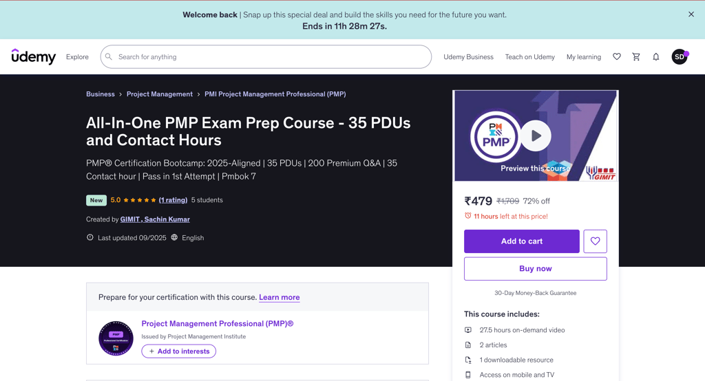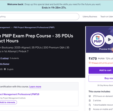 The course is available for a limited-time launch price of ₹479, making it one of the most affordable PMI-authorized PMP prep programs online.