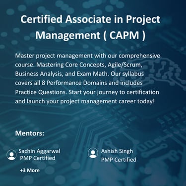 Master project management with our comprehensive course. Mastering Core Concepts, Agile/Scrum, Business Analysis, and Exam Math. Our syllabus covers all 8 Performance Domains and includes Practice Questions. Start your journey to certification and launch your project management career today!